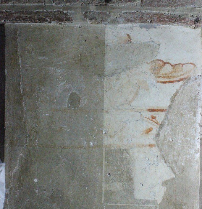 Aside from the north wall of the Nave, which had been conserved on at least three occasions in the ensuing decades, the remainder of the church had been left largely untouched for 80 years, and the paintings, other than those of St Christopher and St Catherine, had become progressively obscured. This deterioration was compounded by the fact that in the 1930s, the prevailing approach to conservation was to cover the paintings with a layer of wax: alarmingly, this was achieved by heating the surface of the painting with a blow-torch and then brushing over with wax, which would immediately turn translucent. What was not appreciated at the time was that the wax prevented the ancient plaster from breathing naturally, and over time absorbed dirt and grime, darkening the paintings to the point that they were far less clear.